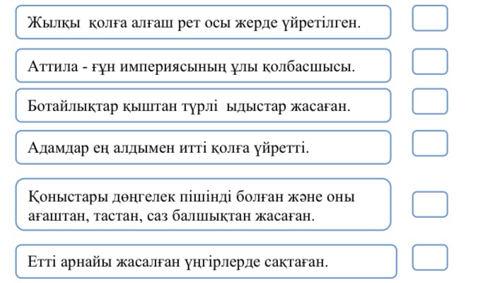 Мәтінді оқиды Сұрақтарға жауап береді Ботай мәдениеті туралы берілген сөйлемдерді анықтайды. Ботай мәдениеті туралы айтады. Суретерді атауымен сәйкестендіреді.Әрбір заттың Ботай мәдениетіне тән ерекшелігін талдайды.