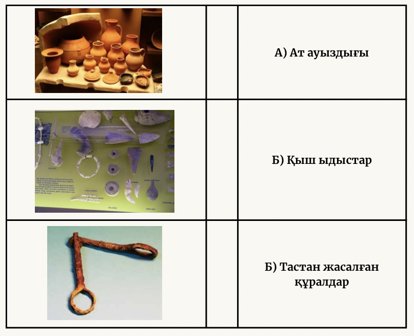 3-тапсырма. Жеке жұмыс. Археологиялық заттарды сәйкестендір және олардың маңызын талда.