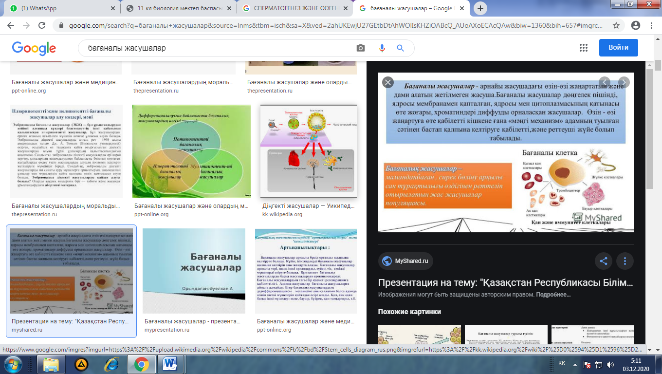 11.2.3.1 - бағаналы жасушалардың мамандану үдерісін және олардың практикалық қолданылуын түсіндіру |
