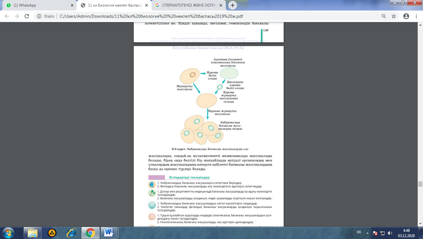 11.2.3.1 - бағаналы жасушалардың мамандану үдерісін және олардың практикалық қолданылуын түсіндіру |