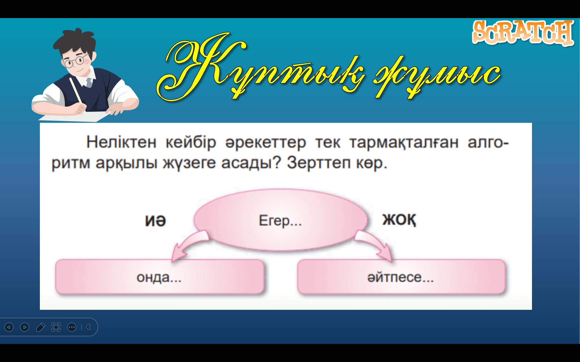 Жеке жұмыс. Компьютерде жеке тапсырма орындау. Тармақталған алгоритмге шарт құру.