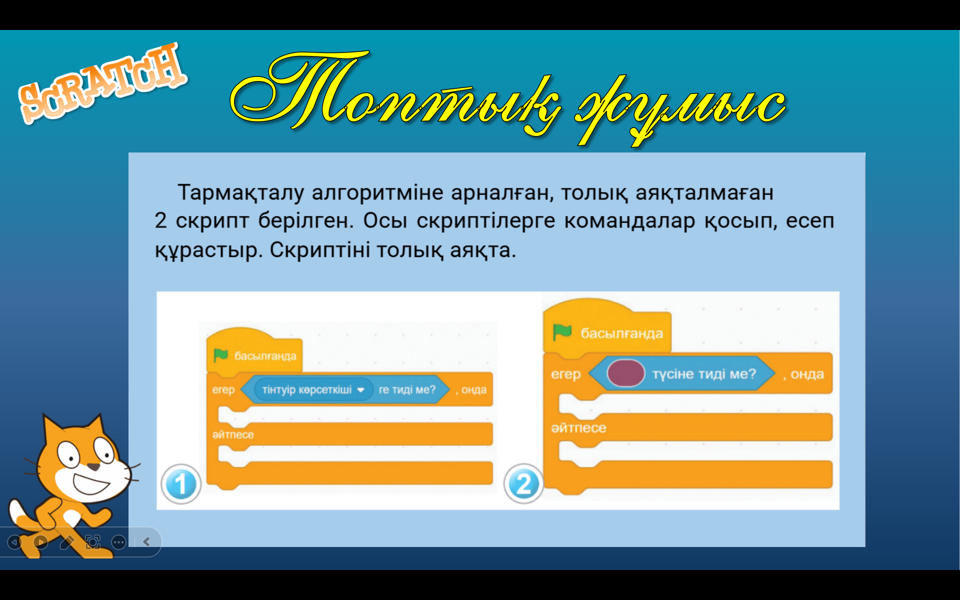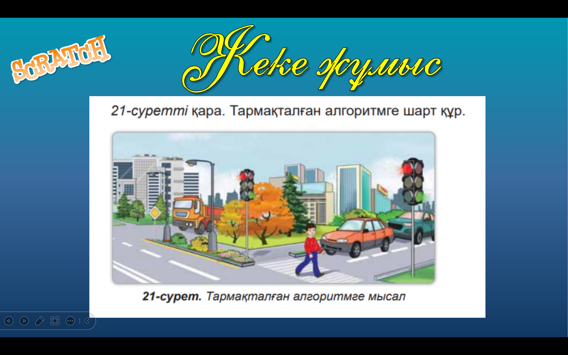 Мұғалімді тыңдайды Бейнероликті қарайды Жаңа ақпараттармен танысады Топтық тапсырманы орындайды Тапсырманы орындайды Тармақталған алгоритм шартын құрады Сергіту сәтін жасайды Сұрақтарға жауап береді |