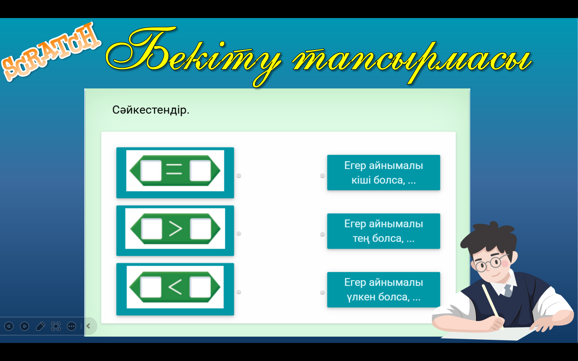 Бектіу тапсырмасы: Тақырыпқа сай бекіту мақсатында сәйкестендіру тапсырмасын орындайды.