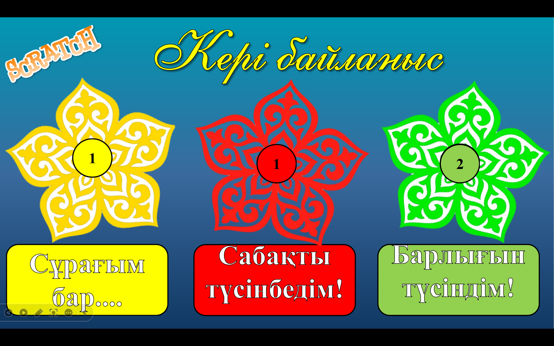 Оқушылар өзін-өзі бағалауды ұйымдастырады. Кері байланыс: Презентацияда берілген қазақша оюларды басу арқылы кері байланыс жасайды