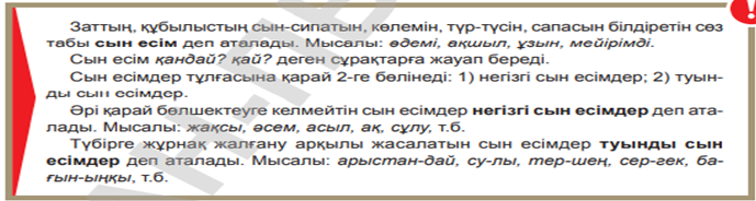 Оқушылар сын есім тақырыбын өз бетінше оқиды, мұғалім оқушылардың жаңа тақырыпты қаншалықты меңгергенін