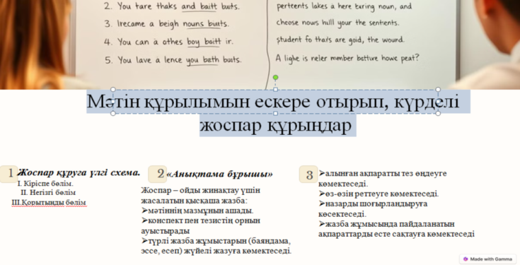 7.2.6.1 оқылым стратегияларын қолдану: комментарий жасау, іріктеп оқу, зерттеп оқу; 7.3.1.1 әртүрлі жанрдағы мәтіндерді жазу үшін құрылымын ескере отырып, күрделі жоспар құру; |