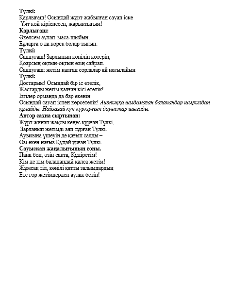 Алтын қақпа ойыны ескі және жаңа сөздердің мағынасын ашуға, сондай-ақ олардың қолданылуын талқылауға көмектесу. «Алтын сақа» ертегісі Бастаушы: Баяғы өткен заманда,Жиделі Байсын жерінде бір бай болыпты.Төрт түлігі сай болыпты,бірақ малдарын ешкімге бақтырмай сенбей,өзі бағады екен.(осы кезде әуенмен әндетіп,бай келеді.) Бай: байлығым бір басымнан артылады дегенде Қимаймын,бөліспеймін Байлықтың,дәулеттің мен иесімін шіренген Жолатпаймын маңайыма ешкімді де. (бай малдарын қайта-қайта санап,шаршап отырады,осы кезде музыка әуенімен Мыстан кемпір кіреді,қолында сиқырлы сыпыртқысы бар.) Мыстан кемпір: Ей-ей, Желемін жортамын Тау-тасты аралап Кенжебек қолға түскенше Алдайын арбайын Салайын айлаға Барынша аттандап Асығып аптығып Кенжебек қолға түскенде шығасың бәрің алдымнан. (Бір кезде Мыстан байды көріп қалып ақырын барып,беліндегі жібімен байды ұстап алады) Мыстан кемпір: Қап,бәлем!Ұсталдың ба? Бай: (көзі алақандай болып, қорқып кетеді)Жібер мені,жібер. Мыстан кемпір:Жо-Жоқ, мен сені жіберсем,сен маған не бересің. Бай: Ат басындай алтын берейін.Қоя бер мені.Ой-бай,қылқынып барамын,бір отар қойымды беремін. Мыстан кемпір:Жоқ.маған сенің алтыныңда,қойың керек жоқ. Бай : Ендеше бір үйір жылқымды беремін. Мыстан кемпір:Жоқ,жоқ.Маған сенің жалғыз ұлың керек. Бай: Қу,жанымай.Ұлымда жалғыз ғой,қайтейін берейін,берейін,жіберші мені. Мыстан кемпір:Жарайды жіберейін,бірақ ұлыңды маған қалай ұстап бересің. Бай:Ертең көшемін, сонда баламның алтын сақасын жұртқа тастап кетейін, сен жұртта сол сақаның жанында отырасың. Ол осы сақаны алуға келгенде ұстап аласың. Бастаушы: Ағаш түбінде отырған Мыстан кемпірге Кенжебек былай дейді. Кежебек:Армысыз әже,Әжетай әкем осында алтын сақамды тастап кетіпті алып беріп жібермейсіз бе? Мыстан кемпір: Шырағым, өзің түсіп ал. Кәріліктен,отырсам тұра алмаймын,тұрсам отыра алмаймын. Кенжебек: Әже,менде жастықтан аттан түссем , міне алмаймын, мінсем түсе алмаймын. Бастаушы: Ат үсітінде тұрған Кенжебек алтын сақаны алмақ болған кезде Мыстан кемпір ұстап алмақшы болады.Кенжебектің ақылды аты оны ала қашады.(Аттың шабысы) Мыстан кемпір:Тоқта,тоқта сен менен құтыла алмайсың. Кенжебек: Құтқарыңдар,құтқарыңдар. Бастаушы: Осы кезде Кенжебектің дауысын естіген батырлар құтқаруға келеді. Би: «Батырлар»(батырлар мыстанды қоршап алып ұстамақшы болады,бірақ мыстан сиқырымен батырларды жеңіп шығады.) Мыстан кемпір:Қап батырларды алдаусыратам деп жүріп, Кенжебекті ұстай алмадым. Бастаушы: Осы кезде көрші ауылдың жүн сабап отырған қыздары Кенжебекті құтқаруға келеді. Би: «Жүн сабау» Мыстан кемпір: Қап,биші қыздарды алдаусыратам деп жүріп,өзімнің шаршап қалғанымды-ай! Бастаушы: Тау түбіндегі Кенжебек ұшып бара жатқан қарлығаштардан көмек сұрайды. Кенжебек: Қарлығаш-ау,қарлығаш Әкеме сәлем дегейсің. Тау астында баласы Ұстап алған мыстаннан Әкем келіп құтқарсын Жеткізші осы хабарды. Бастаушы: Кенжебектің сәлемін естіген әкесі,бір топ уәзірлерімен Кенжебекті құтқаруға келеді. Бай: Тоқтай тұр бәлем!Сазайыңды тартқызайын,ұстаңдар,ұстаңдар мына Мыстанды. Мыстан кемпір:Қайдан шықты мыналар,қайдан шықты.Сиқырымның таусылып қалғанын қарашы.(жан-жағына алақтап,Мыстан кемпір қашады) (Кенжебек әкесін көріп,әкетай – деп жүгіреді.Бай мен баласы құшақтасады,музыка әуені ойналады.) Бастаушы: Міне,осылай бай баласын да,байлығын да 