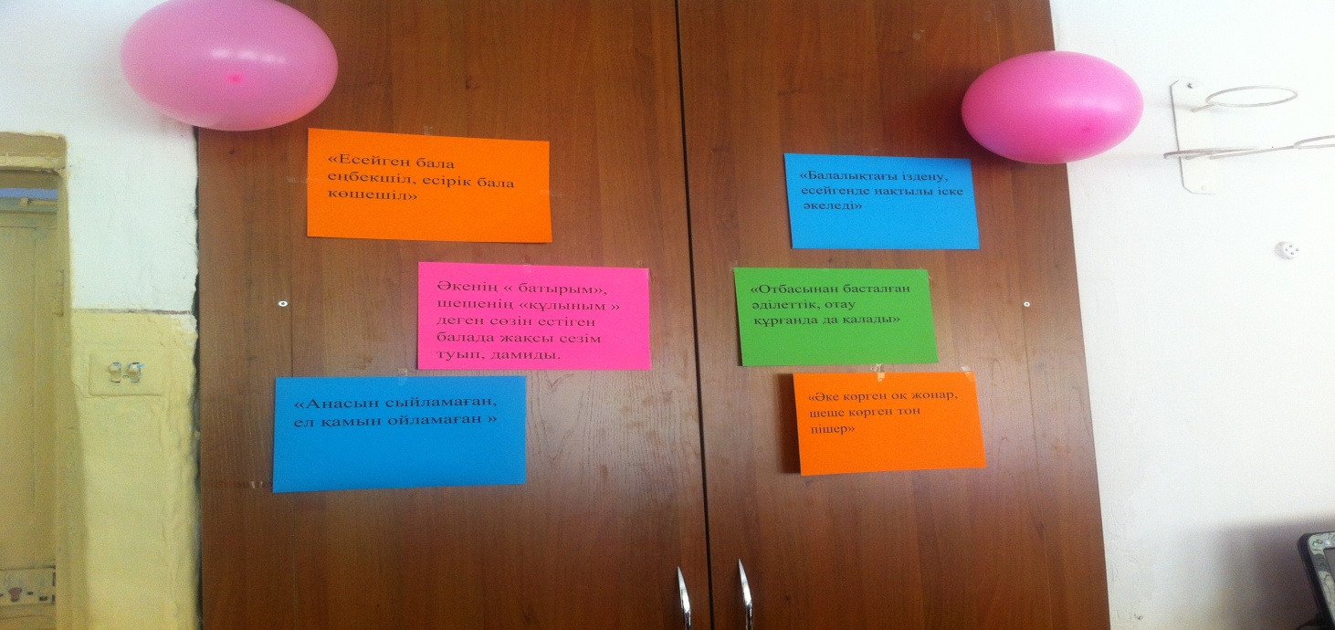 Интернет материалдары, бейнежазба ,слайд , стикер,шарлар, маркерлер, А-4,А-3 парақтар,нақыл сөздер жазылған түрлі-түсті парақтар. Бабалардан қалған нақыл сөздер: 1.Анасы бардың панасы бар, Анасы жоқтың көз жасы бар. 2.Анасын сыйламаған, ел қамын ойламаған. 3.Әкенің « батырым», шешенің «құлыным » деген сөзін естіген балада жақсы сезім туып,дамиды. 4.Отбасынан басталған әділеттік, отау құрғанда да қалады. 5.Бала: атаға, анаға,әкеге,ағаға ,тіпті қала берді үйге келген қонаққа да қарап өседі. 6.Әке көрген оқ жонар, шеше көрген тон пішер. 7.Балалықтағы іздену ,есейгенде нақтылы іске әкеледі |