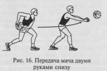 қолмен төменнен беру. Бастапқы жағдайда доп. жамбас тұсында, бір қолдың