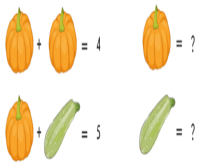 С Зерттеушілік тапсырма. 3-тапсырма. «Суретті санға айналдыр» әдісі. Төмендегі суреттерді қара. Асқабақтың қандай санды, қиярдың қандай санды білдіретінін анықта. Бұл ребусты шешу үшін оқушылардың назарын асқабаққа аудару қажет. Яғни, асқабақпен белгіленген сандар бірдей сандар. 4 санының құрамын есімізге түсіреміз (2+2=4). Осыдан қиярмен қандай санның белгіленгенін анықталады (2+3=5). Жауабы: Асқабақ -2, қияр – 3.