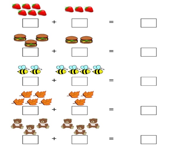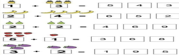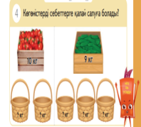 Мұғалім айтады: – Бізде 10кг қызанақ бар. – Оларды 2 себетке тең бөлеміз. 10кг= 5кг + 5кг – Бізде 9кг қияр бар. – Оларды 3 себетке тең бөлеміз. 9кг = 3кг + 3кг + 3кг Қосымша тапсырма: Тапсырма. «Ойлан, тап!» әдісі. Суреттеді санап бос орындарға жазып есептеңдер.