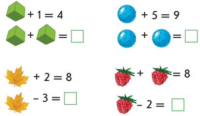 Дәптермен жұмыс. Дәптердегі №1 тапсырманы орындауды ұсынады. Әр мысалдағы үлкен санды қорша. Дәптердегі №2 тапсырманы орындауды ұсынады. Тиісті санды тауып, «сиқырлы» мысалдарды есепте.4 саны – бұл 1 және неше? (1 және 3) Осылай жұмысты жалғастырады. Бірінші мысалда үлкен сан жапырақпен бейнеленген, себебі ол қосындының мәні. Екінші мысалда үлкен сан алмұртпен бейнеленген, себебі ол азайғыш. Тапсырманы өзбетімен орындайды. 3+1=4 4+5=9 3+3=6 4+4=8 6+2=8 4+4=8 6-3=3 4-2=2 Саралау тәсілі. Ресурстық тәсіл. Тапсырма. «Кім жылдам?» әдісі. Қабілеті төмен оқушыларға арналған есептер.
