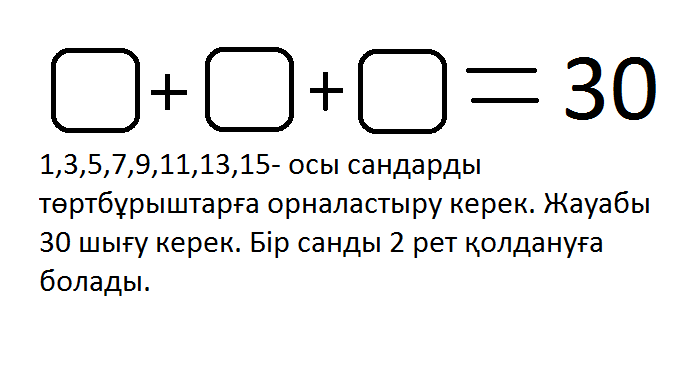 ауыр ма? (тең) 7. Үстел беті төрт бұрыш, оның бір бұрышын кесіп алсақ, неше бұрыш қалады?(5) 8. 5 жыл бұрын Ержан 3 жаста болған. Қазір Ержан неше жаста?
