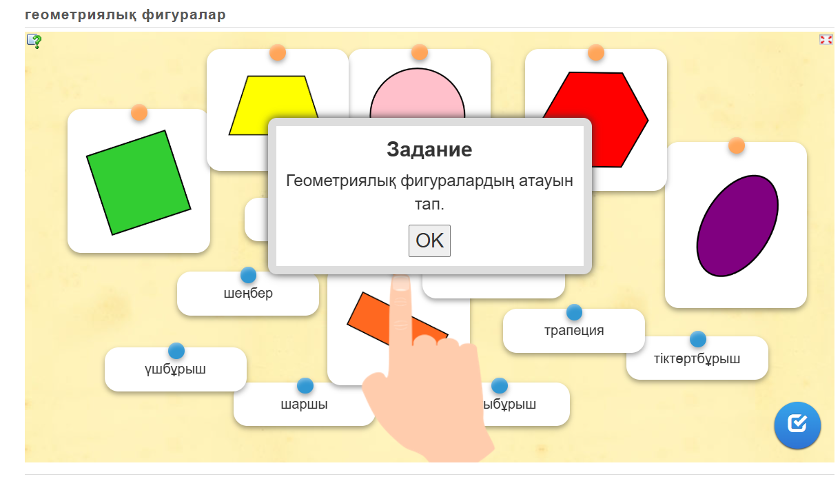 Мақсат: геометриялық фигураларды, оның элементтерін тану, есте сақтау.