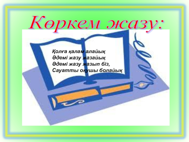 3. Қаламды дұрыс ұстауға машықтандыру (қаламды үш саусақпен қарыстырмай, еркін ұстау, сұқ қолымен үстінен, бармақпен- сол жағынан, ортаңғы саусақпен қағазға әлсіз тиіп, солдан оңға қарай еркін қимылдап, жылжып отыруға тиіс, саусақтар қалам ұшынан 2-2,5 см қашықтықта болуы тиіс, пастаны жиі тексеріп, ауыстырып отыру, оның қатып қалмауын, еріп кетпеуін қадағалау). Көркем жазуды бастаудан бұрын сыныппен біршама даярлық жұмыстары жаза білу икемділігін меңгеруге еректі дәстүрлі ережелерді үйреткен абзал. Бұл ережені орындау нәтижесінде оқушылар жазу техникасының аса бір қажетті шарты – солдан оңға қарай көлбеу жазуға машықтандыру. Жазу жұмысы әріптер тобы бойынша өткізіледі. Көркем жазуға арналған жаттығулардың қатарына әріп элементтері мен тұтас әріптерді жазу, жеке сөздер, сөйлемдер кіреді. Оқу жылының аяғында оқушылардың жазу қарқынын (темпін) біртіндеп жылдамдату,кіші әріптер мен бас әріптерді алфавит ретімен жазу икемділігі қалыптастырылады.