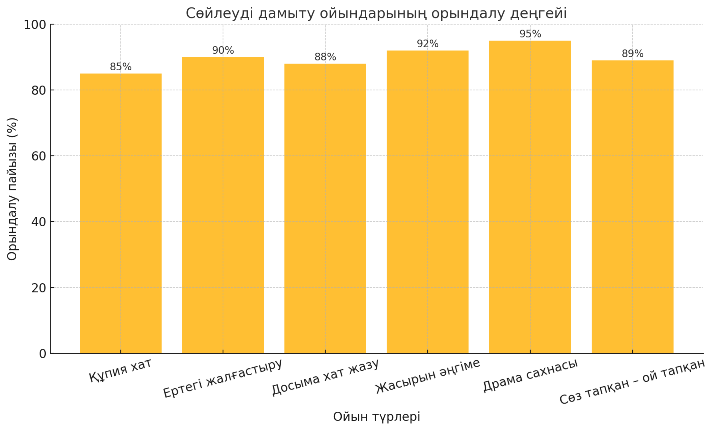 Диаграммада сөйлеуді дамытуға арналған әртүрлі ойындардың орындалу деңгейі көрсетілген. Әр ойын түрі бойынша оқушылардың тапсырмаларды орындау пайызы көрнекі түрде берілген. Бұл диаграмма мұғалімге қай ойындардың тиімді болғанын және қайсысына көбірек назар аудару қажеттігін анықтауға көмектеседі.