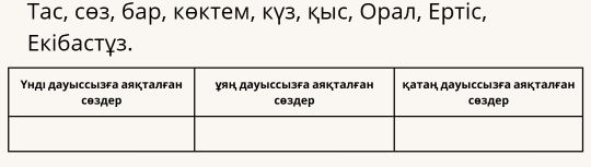 Жеке жұмыс. 4-тапсырма. Берілген сөздерді бағандарға бөліп жазыңдар. Септік жалғауларын жалғаңдар.