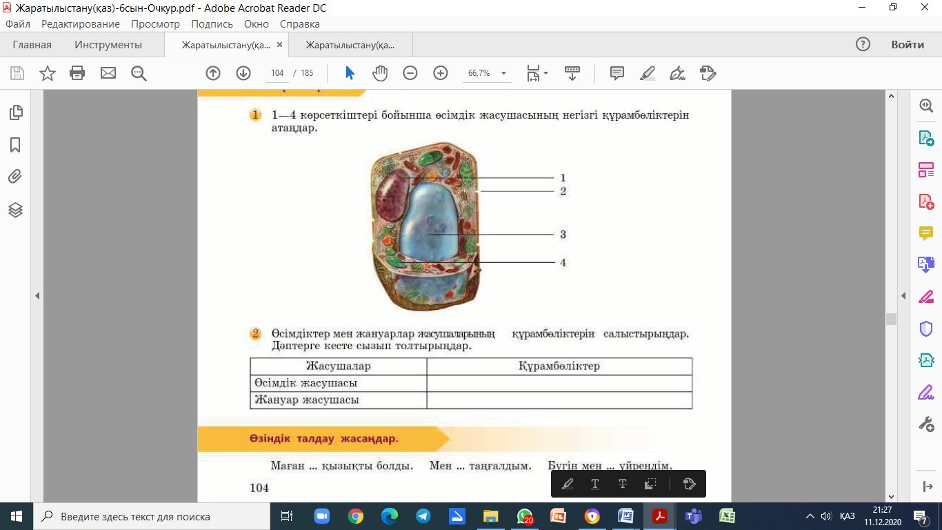 Кілт сөздер: ядро, хлоропластар, жасуша қабықшасы, вакуоль