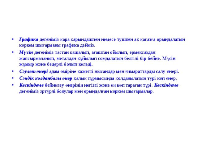 Графика дегеніміз қара қарындашпен немесе тушпен ақ қағазға орындалатын көркем шығарманы графика дейміз.