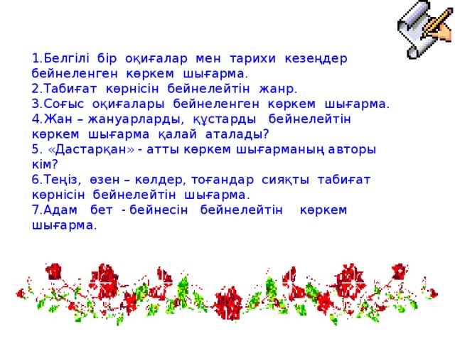 1.Белгілі бір оқиғалар мен тарихи кезеңдер бейнеленген көркем шығарма.