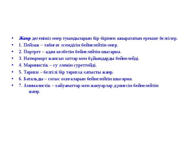 Жанр дегеніміз өнер туындыларын бір-бірінен ажырататын ерекше белгілер.