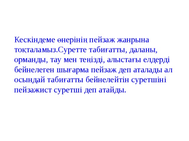 Кескіндеме өнерінің пейзаж жанрына тоқталамыз.Суретте табиғатты, даланы, орманды, тау мен теңізді, алыстағы елдерді бейнелеген шығарма пейзаж деп аталады ал осындай табиғатты бейнелейтін суретшіні пейзажист суретші деп атайды.