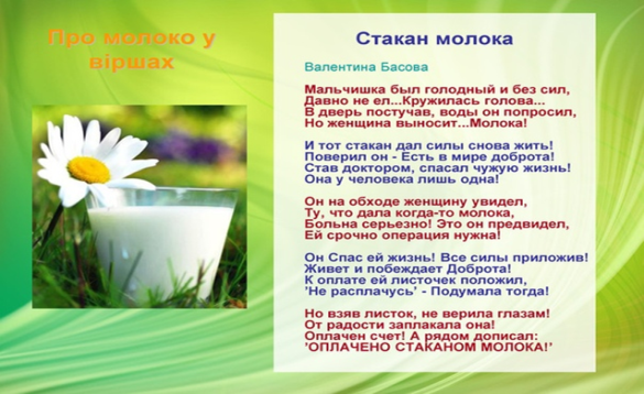 отвечают на Работа в группе І группа «Молоко» ІІ группа «Молочные продукты» ІІІ группа «Молочные напитки» --- Работа над развитием связной речи. «Пейте дети молоко – будете здоровы, потому что молоко делают коровы», – с детства знакомы нам эти веселые строки. Вспомните и напишите молочные и кисломолочные продукты. Организуйте беседу по следующим вопросам: --- 1. Какие бывают продукты по своему происхождению? --- 2. А как называются продукты, которые мы получаем от животных? --- 3. В чем разница продуктов животного происхождения, какие они бывают? --- 4. Какие животные дают молоко? --- 5. Какие молочные продукты вы знаете? --- 6. Какую ценность имеет молоко в жизни человека? --- 7. Что можно приготовить из молока и молочных продуктов? Защита постера Дескриптор 1.Прочитать 2.Найти ключевые слова 3.Нарисовать 4.Дать информацию 5.Защита постера