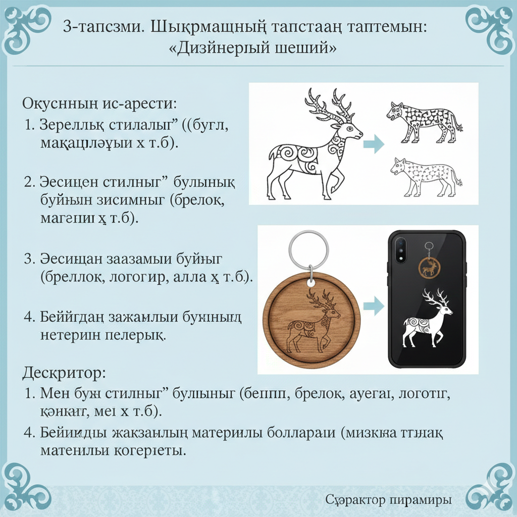 Мәтіннен Берел адамының жас ерекшелігі мен жынысы туралы ақпаратты табады. Оның сырт келбетіне (реконструкция бойынша) антропологиялық сипаттама береді. Жерлеу ғұрпының салтанаттылығына қарап, оның қоғамдағы орны (патша не көсем) туралы дәлелдер келтіреді. Мәтіннен мәңгі тоң қабатының қалыптасуына әсер еткен жағдайларды (тас құрылыстар, оба құрылысы) анықтайды.Мәңгі тоңның жәдігерлерді (мата, ағаш, тері) бұзылмай сақтауға қалай әсер еткенін талдайды.Оба құрылысының схемасын (тас үйіндісі, тереңдетілген лақат) постерге салып көрсетеді. Мәтіннен жылқылармен бірге жерлеу рәсімі туралы ақпаратты жинақтайды. Табылған бұйымдардың (ер-тоқым, ат әбзелдері) неден жасалғанын және оларды сақтау үшін қандай әдістер (бальзамдау, қайың қабығы) қолданылғанын сипаттайды. Табылған олжалардың сақтардың қолданбалы өнері мен мәдениеті үшін маңызын түсіндіреді. Жұптар «бас археолог» және «ғылыми хатшы» рөлдеріне бөлініп, 1998–1999 жылдардағы З. Самашев экспедициясының атмосферасына енеді. Мәтіннен №11 обаның орналасқан жерін және оның ерекшелігін анықтайды. Жылқылардың неліктен жерленгені туралы және денесінің шірімеу себептерін талқылайды. Күнделік жазбасына міндетті терминдерді мағынасына қарай кірістіріп, логикалық ретпен жазады. Жазған күнделіктен үзінді оқиды немесе көрші жұппен алмасып, бірін-бірі тексереді. ханның жауынгерлер арасында жүріп жігер беруі туралы жазады. Моңғол сарбазы болса: Даладағы суық/ыстық, Отырар қабырғаларының алынбас қамалдай көрінуі және Шыңғыс ханның қатаң бұйрығы туралы баяндайды. Оқулықтағы суреттер мен мәтінді пайдалана отырып, Берел қорымынан табылған жәдігерлердегі «аң стилінің» элементтерін (мысалы, алтынмен апталған мүйіздер, мифологиялық жануарлар бейнесі) анықтайды.Таңдап алынған жәдігердің (мысалы, бұғы бейнесі немесе жылқы әбзелдеріндегі өрнектер) қағазға нобайын (эскизін) салады.Салынған ежелгі өрнекті қазіргі заманғы заттарға (брелок, сырға, киімдегі логотип, телефон қабының дизайны т.б.) қалай қолдануға болатынын ойластырады.Өз жұмысын сынып алдында қорғап, таңдаған дизайнының сақ мәдениетімен байланысын және оның маңызын айтып береді. Ақиқат Жалған Ақиқат Ақиқат Жалған Жалған Ақиқат Ақиқат |