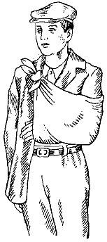 Рис. 1. Прибинтовывание руки, согнутой в локте под прямым углом, к туловищу. Первая помощь: положить в подмышечную впадину поврежденной стороны небольшой комок ваты, марли или какой-нибудь материал; прибинтовать руку, согнутую в локте под прямым углом (рис. 15), к туловищу, причем бинтовать следует от больной руки к спине, руку ниже локтя подвязать косынкой к шее, на область повреждения — холод.