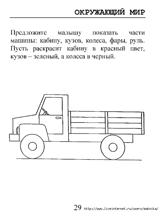 Тапсырма: балаға машинаның суретін көрсетіп, оның бөліктерін атап беруін сұра (кабина, кузов, дөңгелек, фарын және рульді көрсет) және машинаның кабинасын қызыл түске, кузовын жасыл түске, ал дөңгелектерін қара түспен боя.