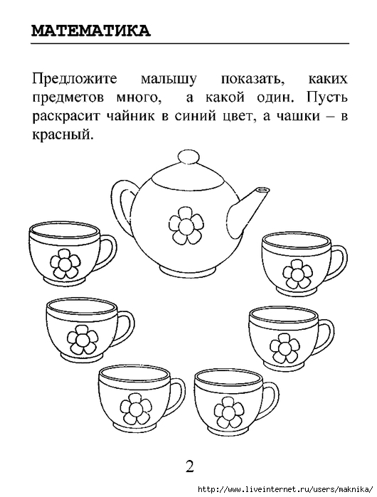 Тапсырма: қай заттың көп, қай заттың біреу екенін көрсет. Шәйнекті көк түспен, ал кружканы қызыл түспен боя.