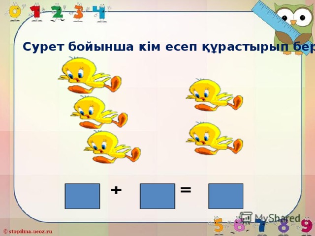 Көктем. Күн жылына бастайды, жаңбыр жауып жел тұрады. Құстар жылы жақтан ұшып келеді. Бәйшешек гүлі шығады. Ағаштар бүршік жарады. 6+1=7 6-1=5