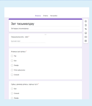 Оқушылардың игерілген білімдерін тексеру мақсатында ZipGread, Googl.forms платформаларында тест құрастырамын. ZipGread платформасының ерекшелігі оқушылардан ұялы телефонды және интернетті қажет етпейді. Бұл платформалардың тиімділігі оқушылардың жауаптарын көруге болады. Қай сұрақтарды оқушылар дұрыс жауап бергендерін, қандай сұрақтар қиындық тудыратындарын көруге болады (3- сурет).
