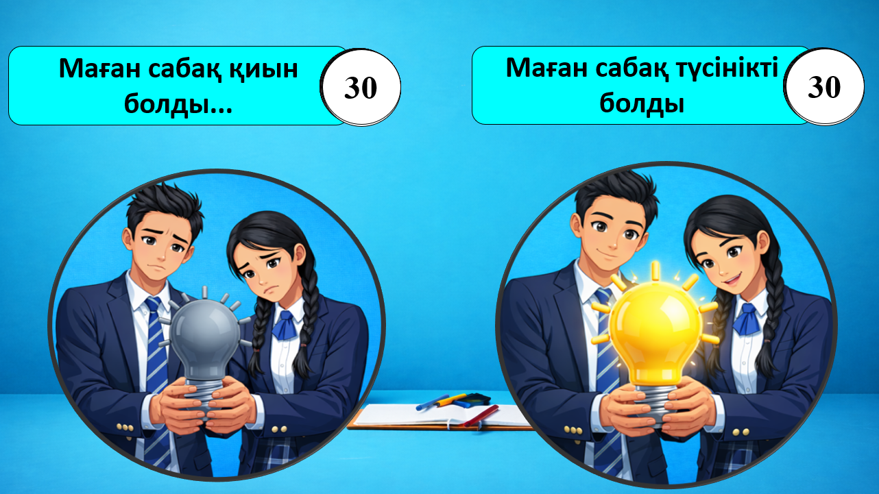 Жасанды көмекші арқылы оқушылар кері байланыс береді. -Маған сабақ түсінікті болды -Маған сабақ қиын болды Үй тапсырмаларын жазып алады Үйге тапсырма:№ |
