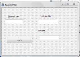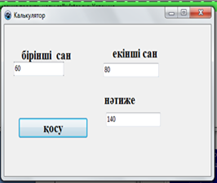 Тапсырма 4 «Калькулятор» жобасын дайындау. Тапсырма. Екі санның қосындысын табатын қарапайым калькулятор жобасын жасаңдар. 1.«Lazarus» программалау ортасын іске қосыңдар. 2.Form1 терезесінің Caption қасиетіне Калькулятор мәнін беріңдер. 3.Жобаға Label1, Label2, Label3 компоненттерін орналастырып, Caption қасиеттеріне Бірінші сан, Екінші сан, Нәтиже мәндерін беріңдер. 4.Edit1, Edit2, Edit3 компоненттерін түсіріп, Text қасиетін тазалаңдар. 5.Button батырмасын орналастырып, Caption қасиетіне Қосу мәнін беріңдер. 6.Қосу батырмасын екі рет шертіп, ашылған код терезесіне екі санның қосындысын есептеу программасын жазыңдар. 7.procedure TForm1.Button1Click(Sender: TObject); var num1,num2,rezult:integer; begin num1:=StrToInt(edit1.Text); num2:=StrToInt(edit2.Text); rezult:=num1+num2; edit3.Text:=IntToStr(rezult); end; end. 8.Іске қосу батырмасын немесе Ғ9 батырмасын басып нәтижесін аламыз.