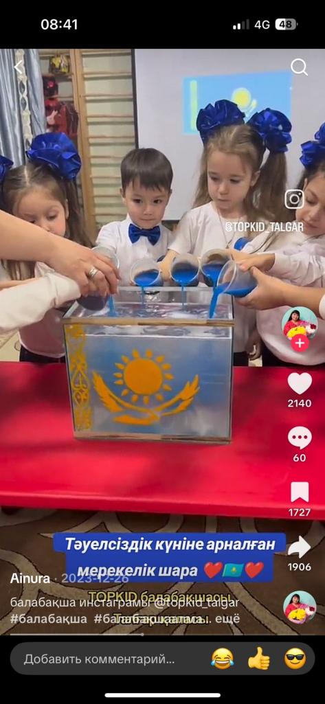 Күтілетін нәтиже: Біледі: балалар мерекенің маңыздылығын түсінеді; балалар заң туралы білімге ие. Игереді: қазақ тілінде белсенді сөйлеу дағдылары, ойын қызметі. Менгереді: ойлау, бірге ойнау, ән айтуды меңгереді.