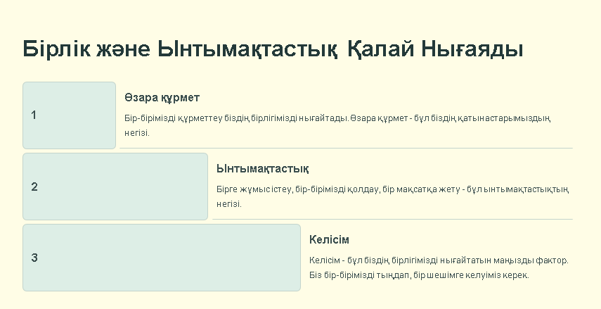 Мақсаты: Оқушыларға бірлік пен ынтымақ құндылықтарын түсіндіріп, оны тәжірибеде қолдану жолдарын көрсету. Шығармашылық тапсырмалар арқылы оқушылардың қиялын, коммуникативті дағдыларын дамыту. |