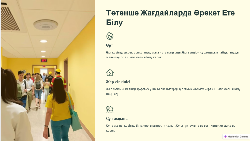 Тапсырма 1: Ситуациялық тапсырмалар. Әр топқа төтенше жағдай сценарийі беріледі (өрт, жер сілкінісі, т.б.). «Не істеу керек?» сұрағына жауап іздейді. Көмек шақыру