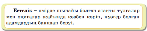 (Ұ) 1- тапсырма «Тізбек» әдісімен орындалады. А) Суретпен жұмыс. Жамбыл Жабаев туралы әңгімелеңдер. Жамбыл Жабаев (1846–1945) қазіргі Жамбыл облысының Хан тауы мен Жамбыл тауының етегінде туған. Жамбыл Жабаевты нағыз ақын ретінде байтақ елге танытқан – айтыс өнері. Ә) Мәтінмен жұмыс: «Жәкем» атты естелікті түсініп оқыңдар. Анықтама: