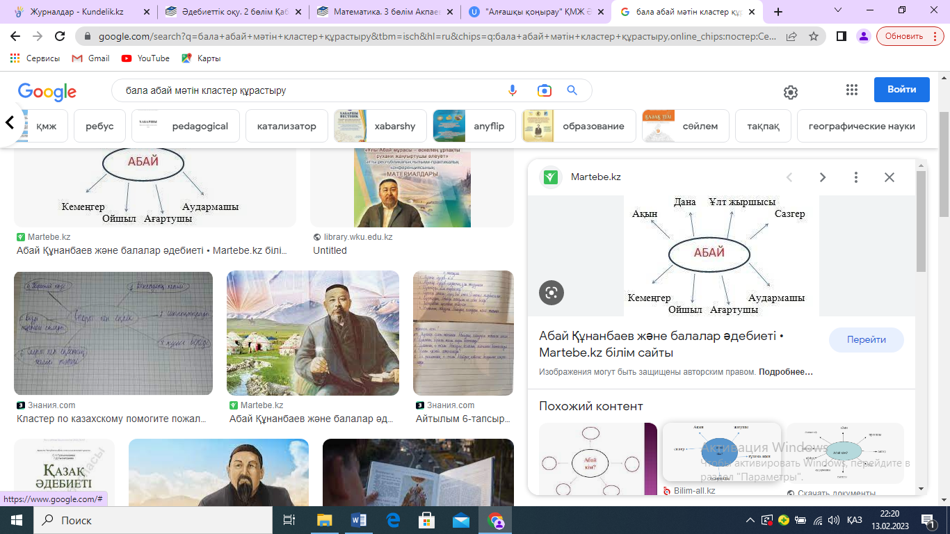 Сергіту сәтінде Абай әндерін орындау. Тапсырма №3 Қарама-қарсы сұрақ . Мәтін қалай аталады? -Мәтінде бала Абайды қалай сипаттаған? -Дос тапты деп отырғаны кім еді? -Әжесі әңгімені қалай бастауыш еді? -Әжесі Абайға тағы не айтып беруші еді? -Әжесінің аты кім? -Өлең сөзді көп айтатын кім еді? -Анасының аты кім? -Әңгімеден не ой түйдің? -Бала Абай нені ерекше жақсы көрді? ... Абайдың жасы қаншаға толған еді. -. Абайдың әжесі әңгімесін қалай бастап еді? -. Абай қайдан көп шықпайтын болды? -. Абайға әңгімені кім көп айтушы еді? . Абайдың шешесінің есімі кім? - Абай әжесінің әңгімесін қалай тыңдайтын? - Абай жолы романын кім жазды? -М. Әуезов қай өңірде дүниеге келді? -Абайдың шын есімі кім болды? 4-тапсырмада Сыни сұрақтар . Мәтін Бала Абай деп аталады? -Бала Абай он төртке толған еді. Бойы өспей қалған ..... -Үйден көп шықпайды .... -Дос тапты деп отырғаны әжесі.. -Әжесі әңгімені көп айтпайтын.. -Әжесі Абайға ертегі көп айтпайтын.. -Әжесінің аты Ұлжан .. -Өлең сөзді көп айтатын әжесі еді -Анасының аты Зере еді -Бала Абай ертегіні жақсы көрді ... Абайдың жасы он үшке толған еді. -. Абайдың әжесі әңгімесін ерте , ерте деп бастайтын -. Абай үйден кқп шығатын -. Абайға әңгімені атасы кқп айтатын . Абайдың шешесінің Зере - Абай әжесінің әңгімесін дұрыс тыңдамайтын - Абай жолы романын М. Әуезов жазған ... -М. Әуезов Алматы облысында дүниеге келген.. -Абайдың шын есімі Абылай болған |