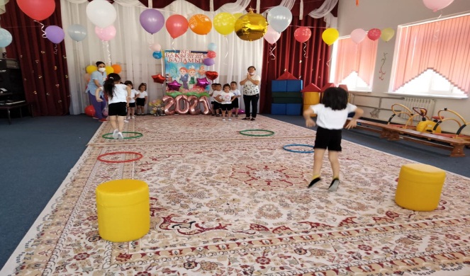 Ойын шарты: Жердегі кругтан-кругқа қос аяқтап секіріп, межеден айналып ,кері жүгіріп қайту.