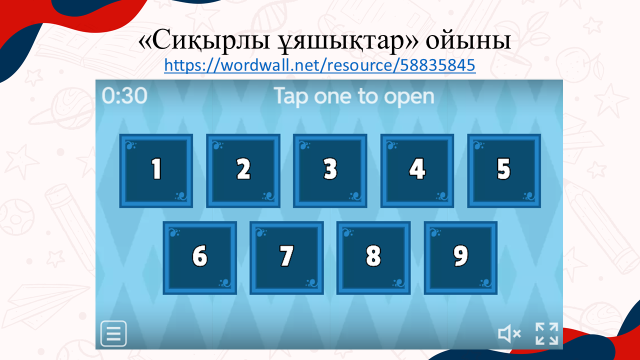Бекіту «Ұяшықтар» әдісі Оқушылар ұяшықтарды ашу арқылы сұрақтарға жауап береді.