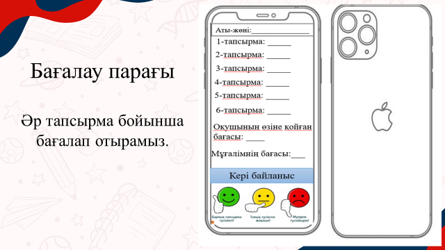 Үй тапсырмасы: Ережелерді қайталау. Бір сөзді септеп жазып келу. Кері байланыс: Сабақтан алған әсерлерін стикерге жазып, суретін жібереді |