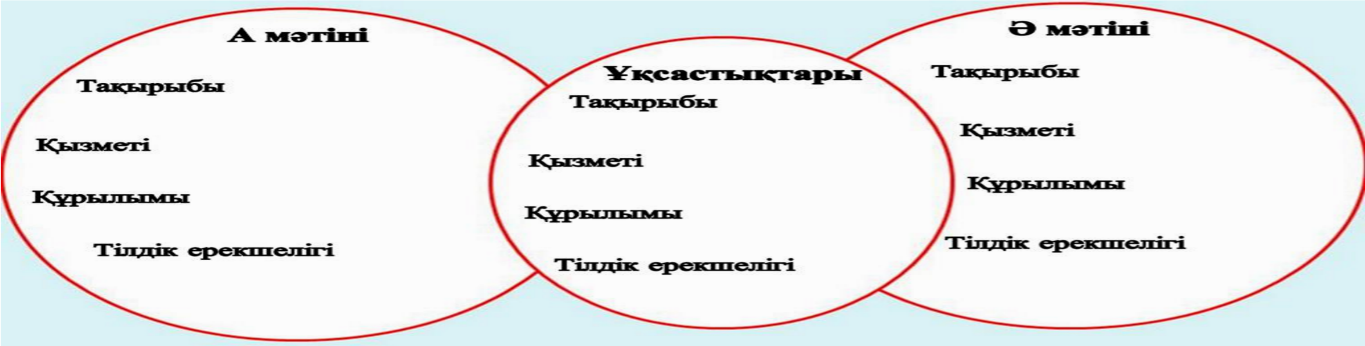 Мәтіндердің ұқсастықтарын табады; тақырып қызметі құрылымы тілдік ерекшеліктері |