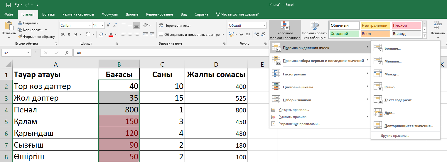 Электрондық кестеде шартты пішімдеуді қолданады |