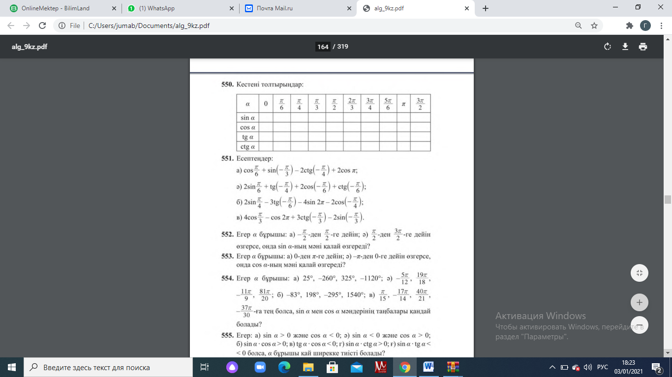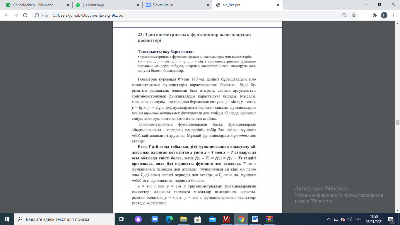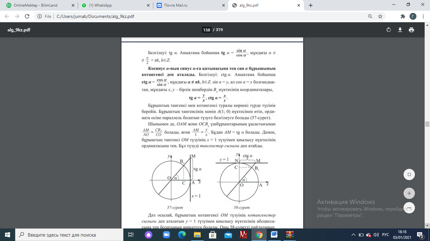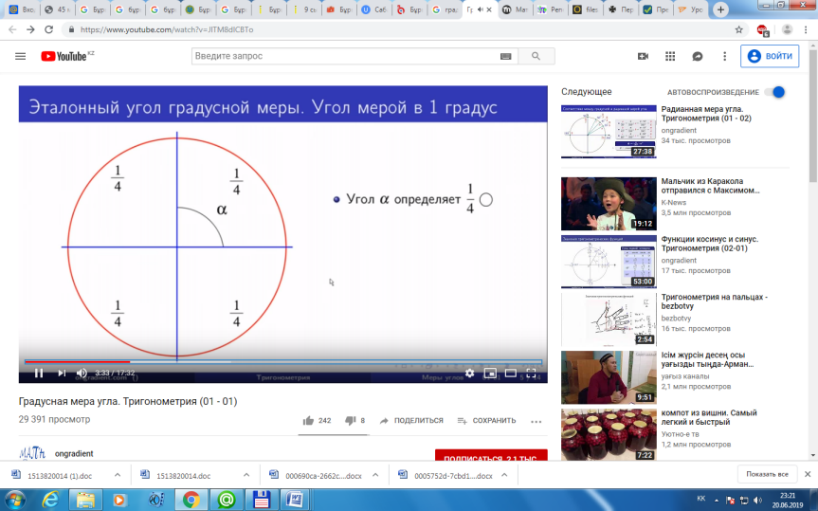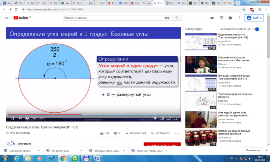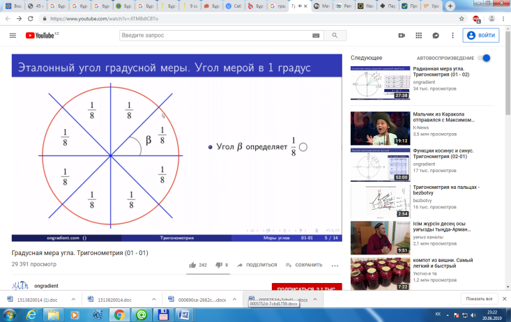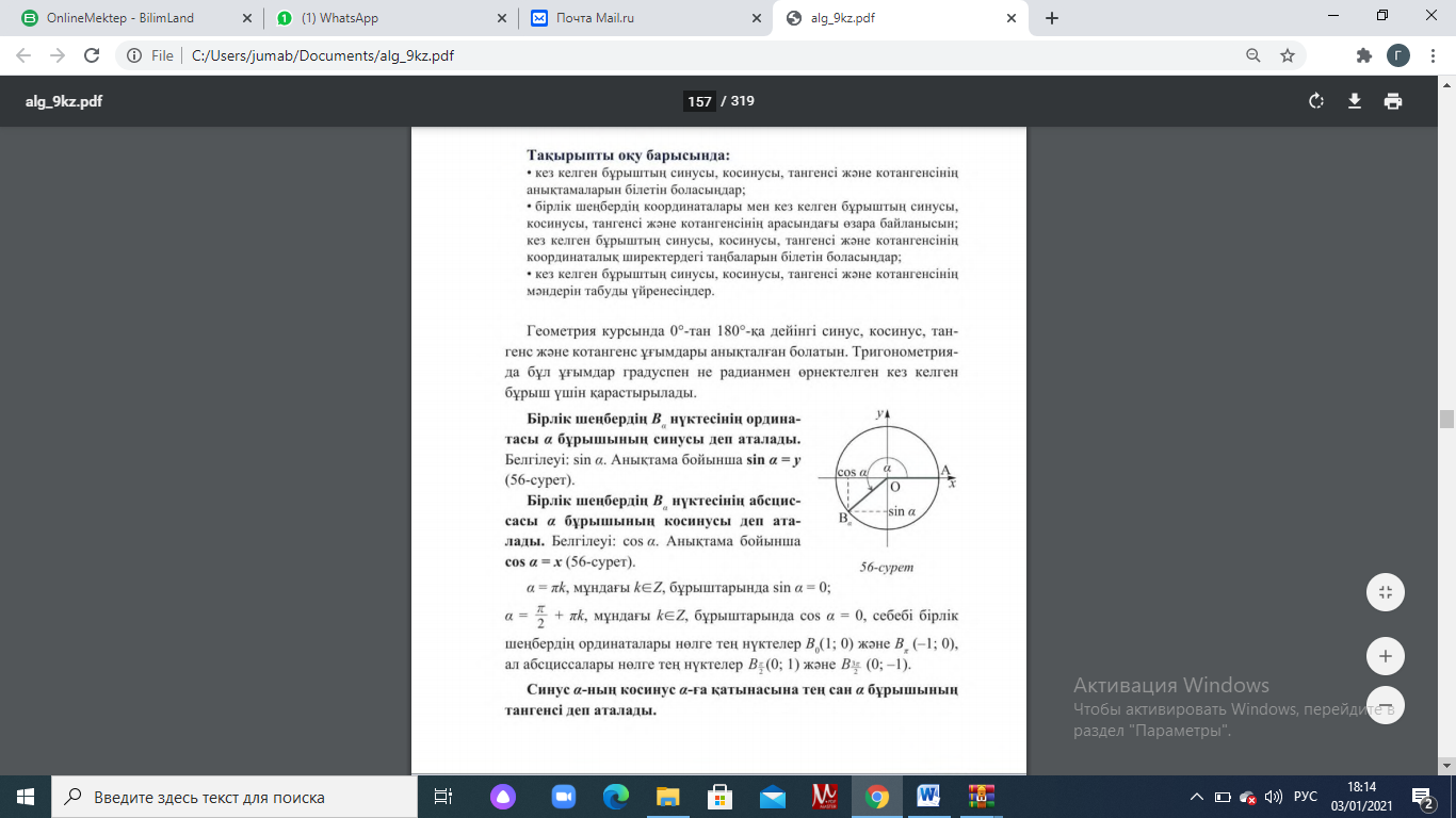 9.1.1.1бұрыштың радиандық өлшемі ұғымын меңгеру; 9.1.2.1градусты радианға және радианды градусқа айналдыру; |
