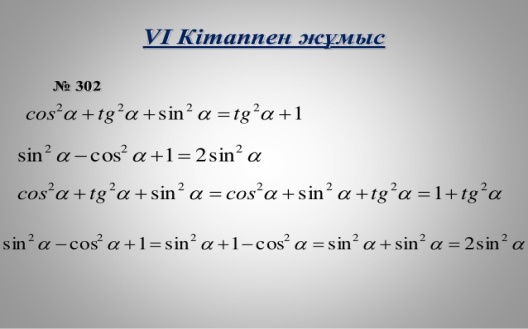 Сәлеметсіздерме! Бүгін, Тригонометрия формулалары. Келтіру формулалары тақырыбын қарастырамыз Бүгінгі сабақта меңгеретініңіз: - Келтіру формулаларын біледі; -Келтіру формулаларын есептер шығаруда қолданады Үй тапсырмасын тексеру. №302. |