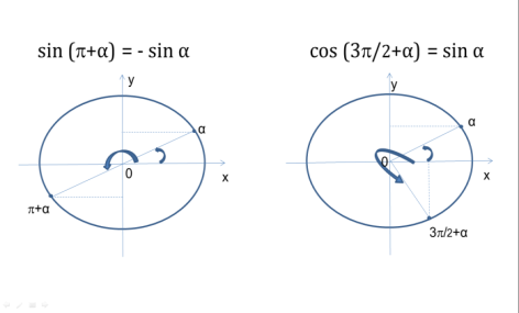 Содан соң оқушылардан sin (+α) = - sin α және cos (3/2+α) = sin α формулаларын бірлік шеңберде өздігінен дәлелдеуді сұрау: сондай-ақ мәндерін табуды sin (-α) = … және cos (3/2-α) = ….. қорытындысын талқылау. sin (+α) = - sinα