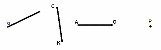 А) ОА кесіндісі, а түзуі , P нүктесі, СК сәулесі В) а түзуі, СК кесіндісі, ОА сәулесі, Р нүктесі С) СК сәулесі, ОА кесіндісі, Р түзуі, a нүктесі D) а сәулесі, СК кесіндісі, ОА түзуі, Р нүктесі