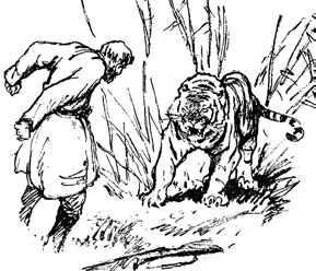 Аңшы артынан естілген сыбдырға жалт қарайды. Өзіне қарай келе жатқан сары ала жолақты, сойдақ тістері ақсиған жолбарысты көріп, қорқып кетеді.